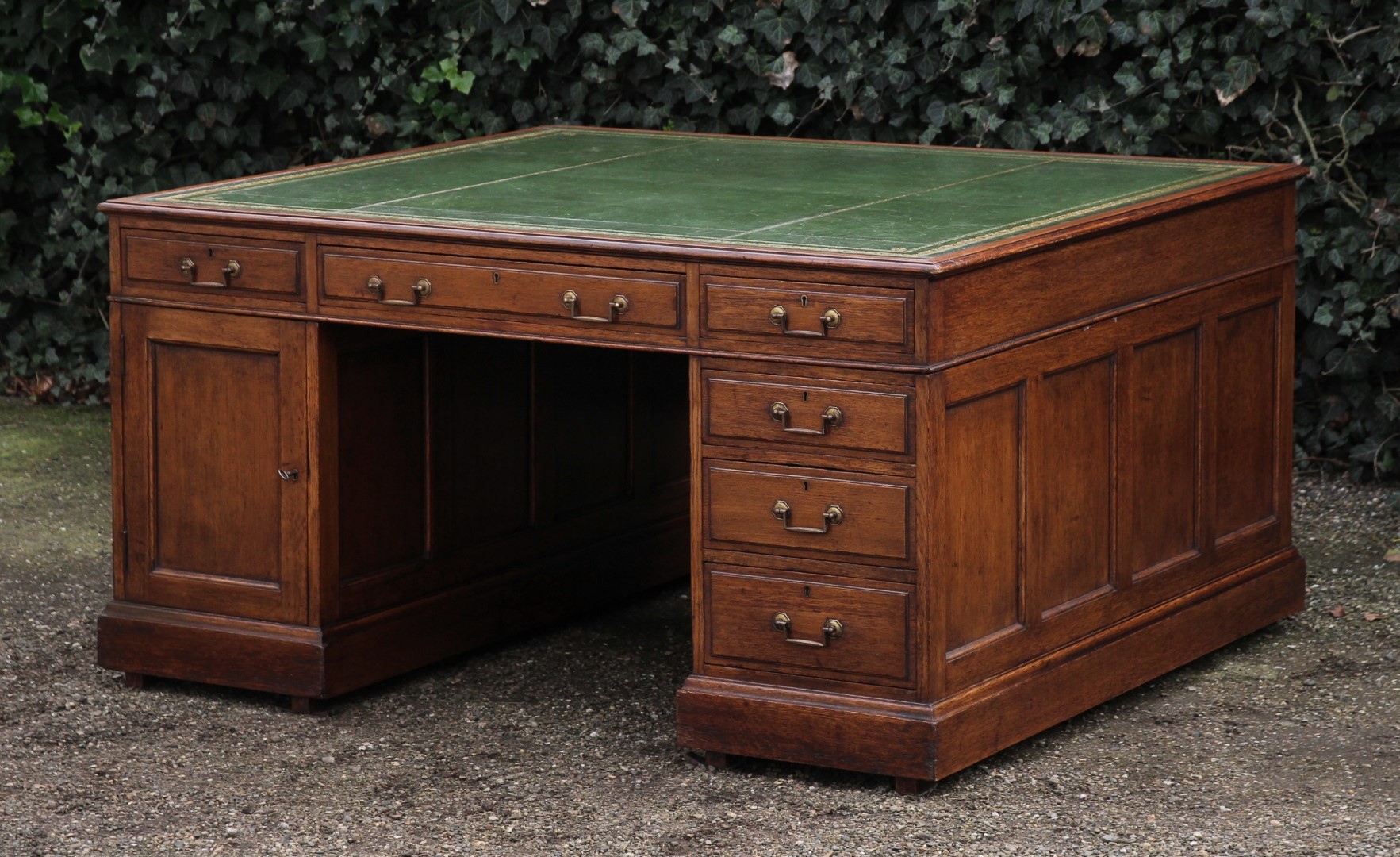 Opm.: Prachtige 19e-eeuwse partnerdesk / bureau met een stijlvol groen lederen inlegblad.Dankzij de royale opzet biedt het bureau veel praktische opbergruimte, ideaal voor zowel werken als organiseren.